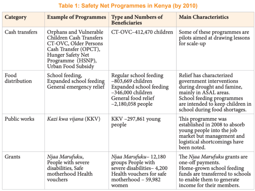 safety net programmes in place such as Inua Jamii (“empowering the community” in Swahili), a cash transfer program available to vulnerable persons in Kenya. However, the policy indicated that these efforts were inadequate as they have kept people alive but did not reduce poverty.