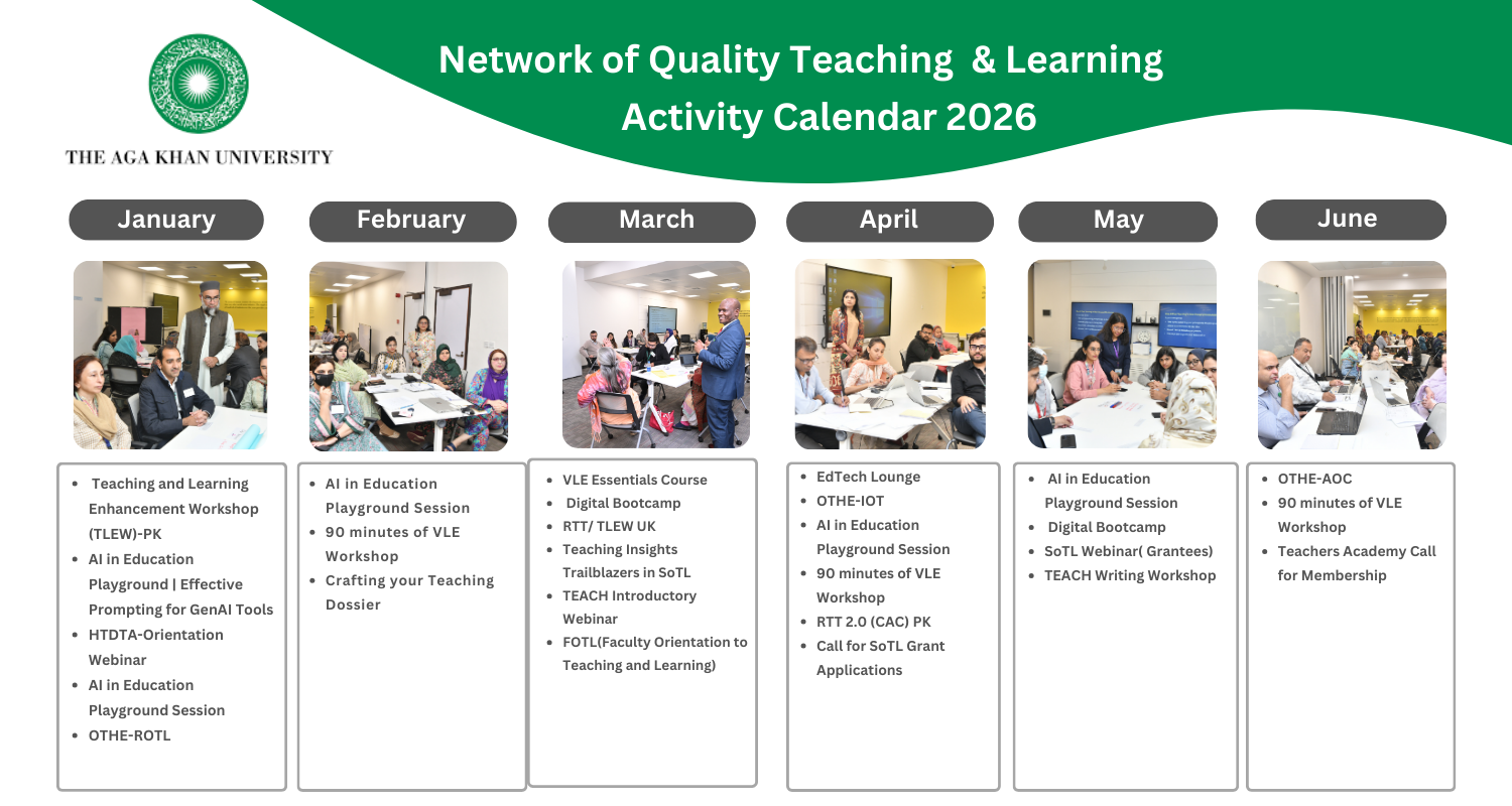 The AKU-wide Network of Quality, Teaching and Learning was set up by the Provost in 2013 with the aim of supporting excellence in our academic programmes to ensure a strong student learning experience that enables AKU graduates to meet their programme learning outcomes.